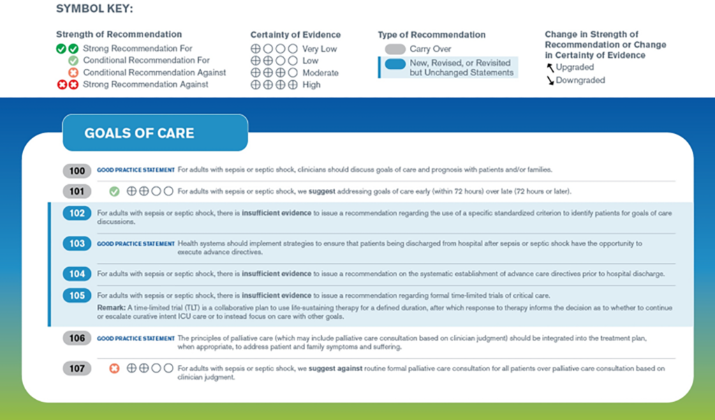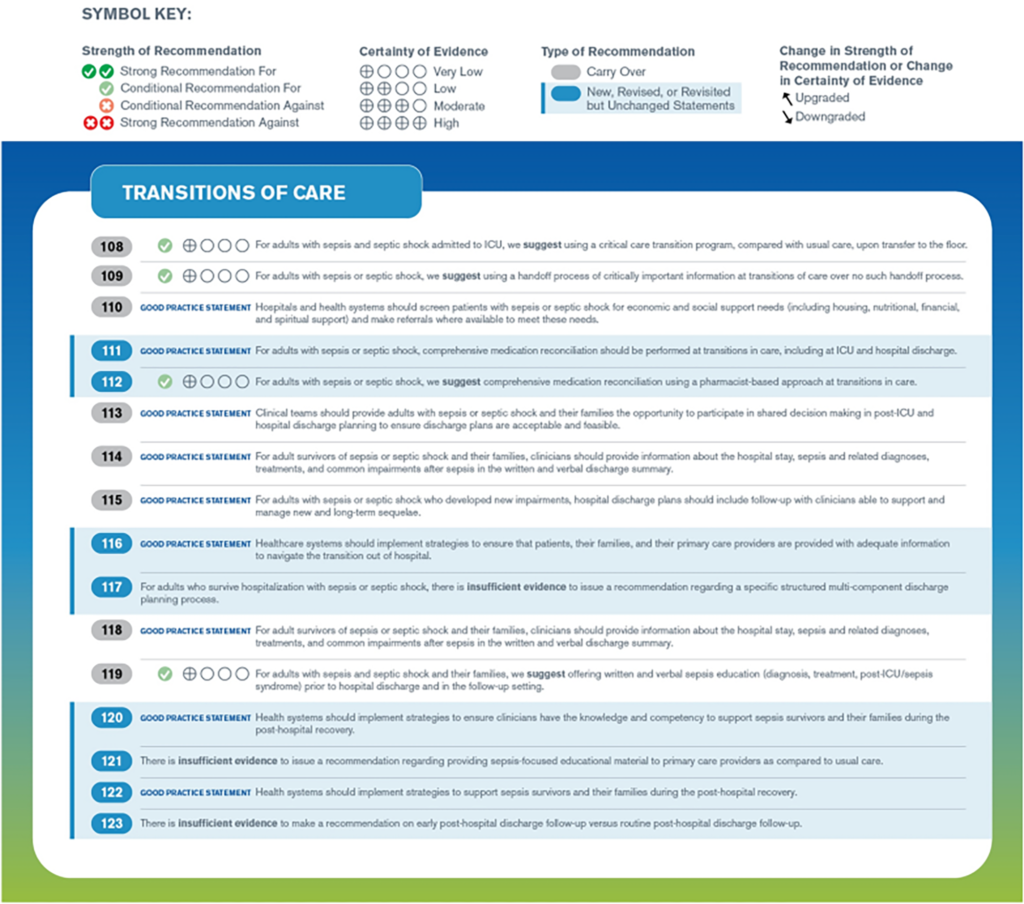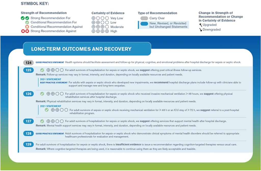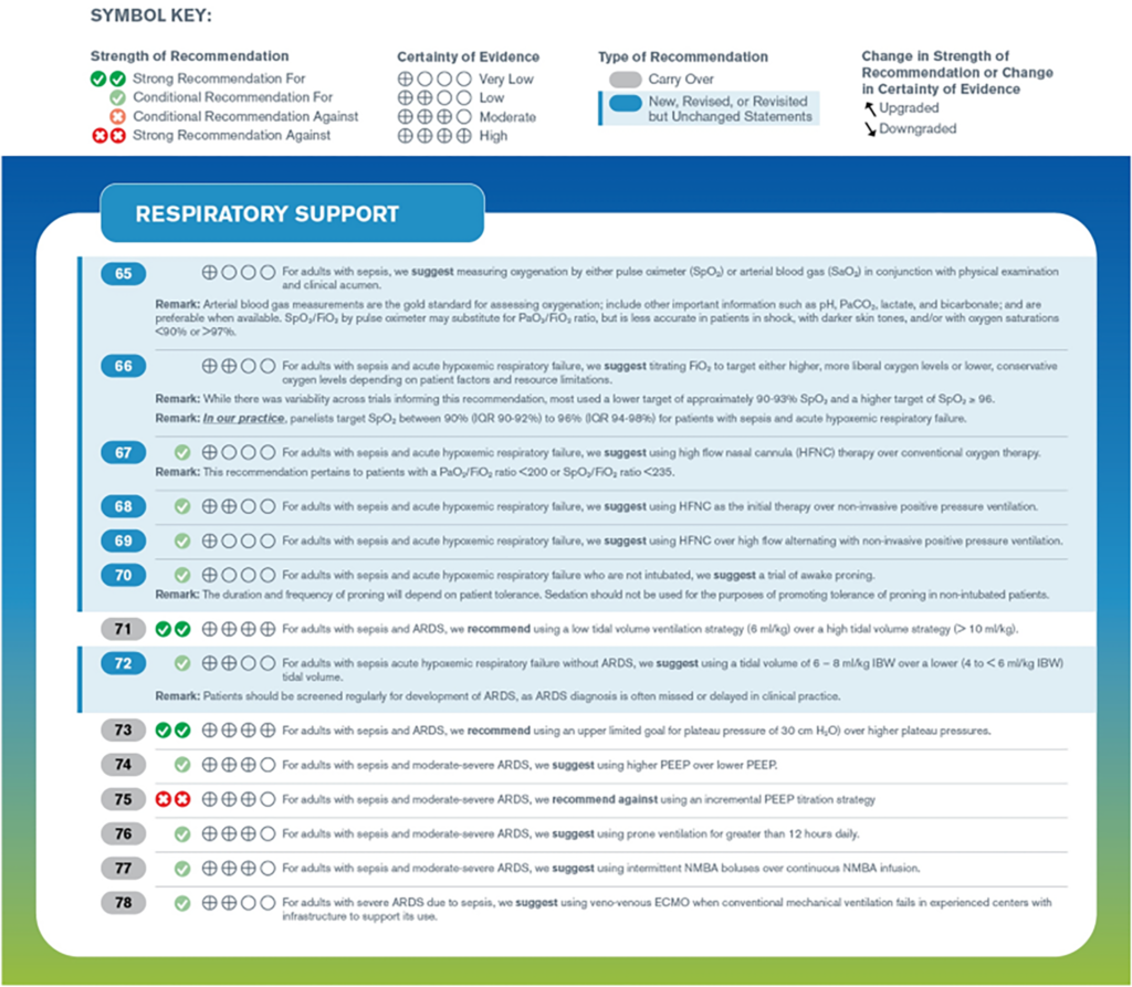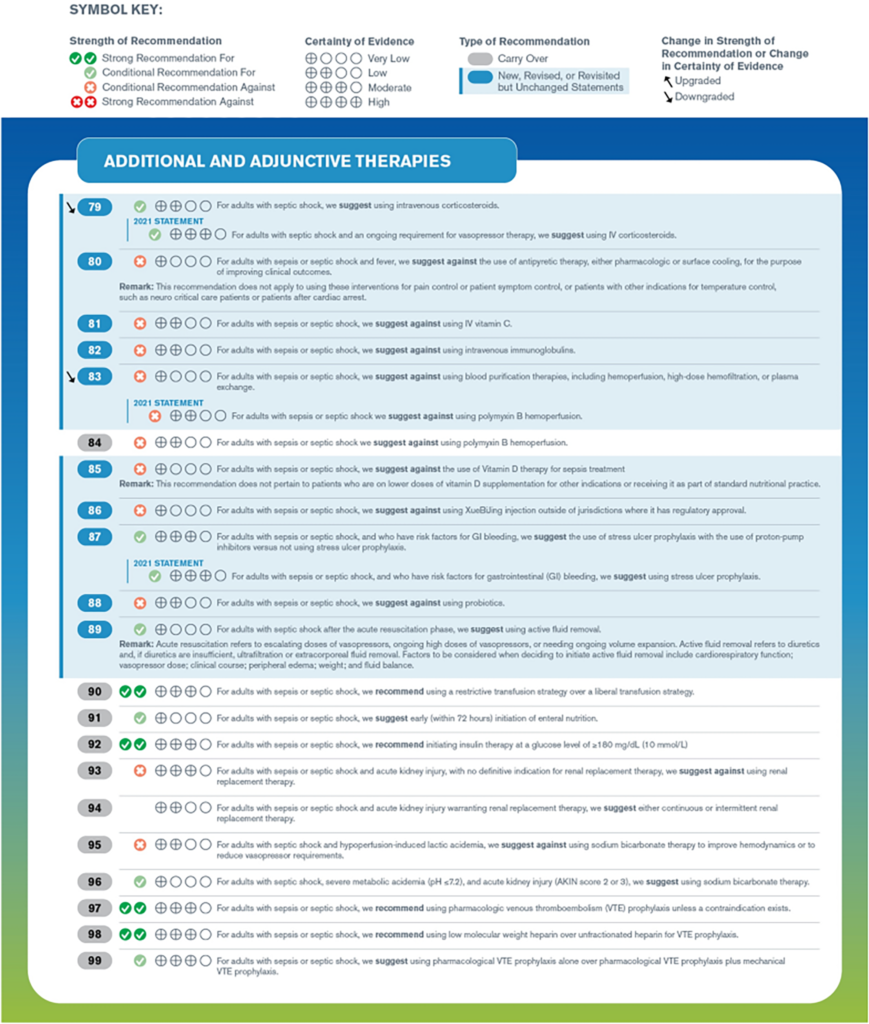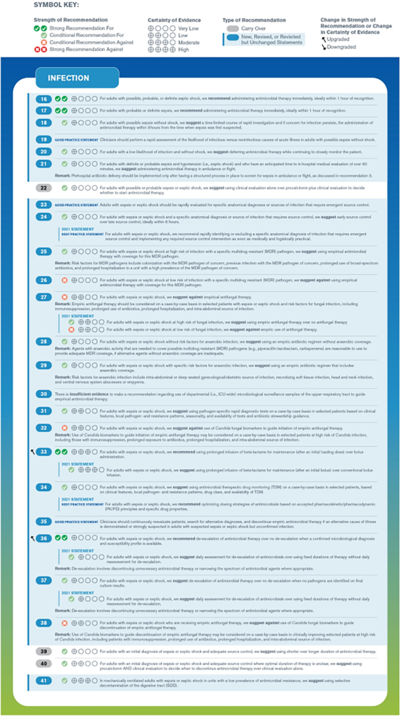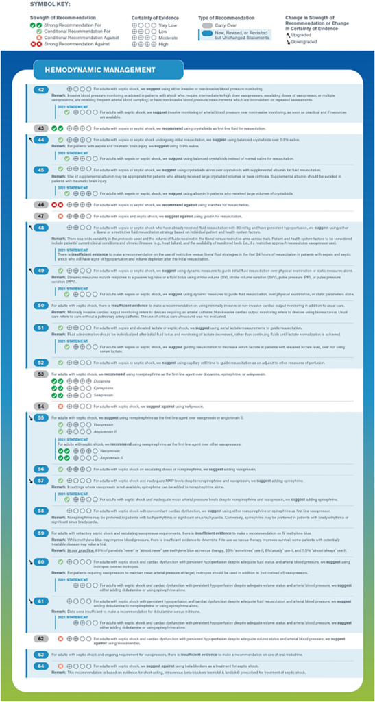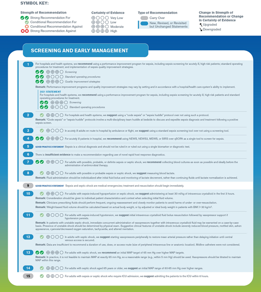 Các hướng dẫn được tóm tắt theo các nhóm lớn gồm: Sàng lọc và xử trí sớm, điều trị nhiễm trùng, ổn định huyết động, hỗ trợ hô hấp, các điều trị hỗ trợ, mục tiêu chăm sóc, chuyển tiếp giai đoạn điều trị và hồi phục về lâu dài.